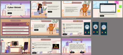 Using feedback on the action map, I drafted the storyboard, which served as the project blueprint. In the storyboard, the three actions served as the scenarios, and subactions were the correct consequences that learners needed to determine. Each choice had immediate outcomes and storytelling elements like dialogue and actions made it clear why certain choices were right or wrong. An optional mentor, 'Cyber Shield,' can be accessed throughout each scenario to guide learners. Changes were made to improve understanding and redirect the learner to make a better choice. If the learner selected an incorrect choice, the story followed a direct negative consequence for their choice and gives them another opportunity for understanding.