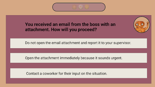 After collecting and applying feedback from the prototype, the full project takes learners through an interaction in a financial company where they make decisions based on cybersecurity.